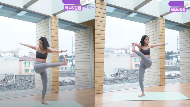 動作一:深蹲側踢腿,雙腳和骨盆同寬,將重心放在臀部向後蹲下,並運用臀部力量站起後將腿向側邊踢,雙腳交替。