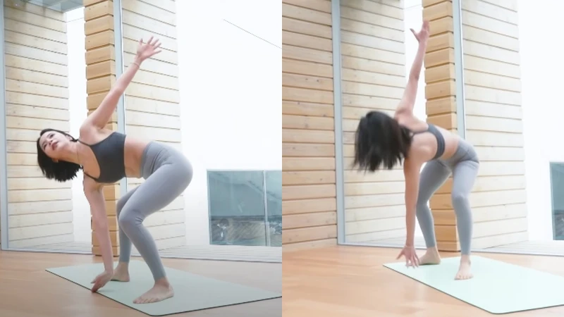 動作一:將身體前傾,重心擺在左腳,將右腳向後踏並舉起雙手,收回右腳同時將雙手放下觸膝,做完20秒休息10秒後換邊。