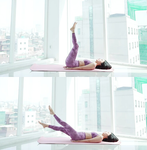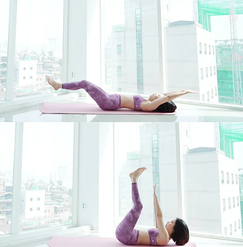 平躺後手放在身體兩側,將腳上抬至90度後放下至30度左右,將雙腳在空中交叉6下,這樣為一下,然後重複8次。抬腿的時候要注意不要把腰抬起來。