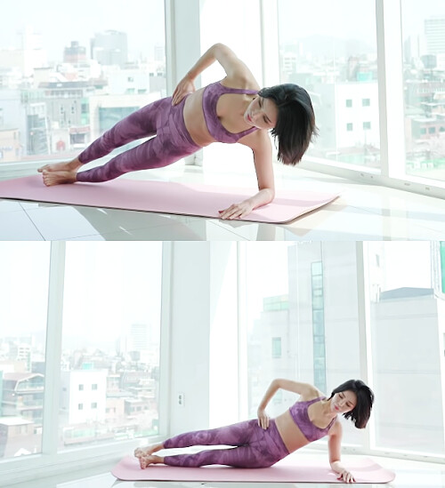 從側平板的姿勢開始,運用側腹肌的力量將臀部向上抬,記得將身體往下放時不要放鬆才不會受傷,而是將腰部的肉往下推才對。
