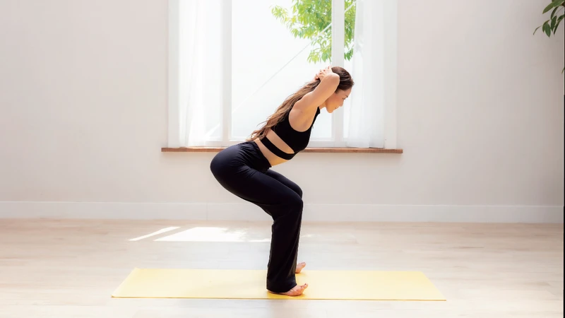步驟2. 一面將臀部往後拉,同時慢慢地使腰部往下移動,再將上半身前傾。