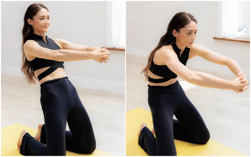 步驟1. 腳尖立起,再將膝蓋立起,並將雙臂於肩膀高度打直後雙手交握。