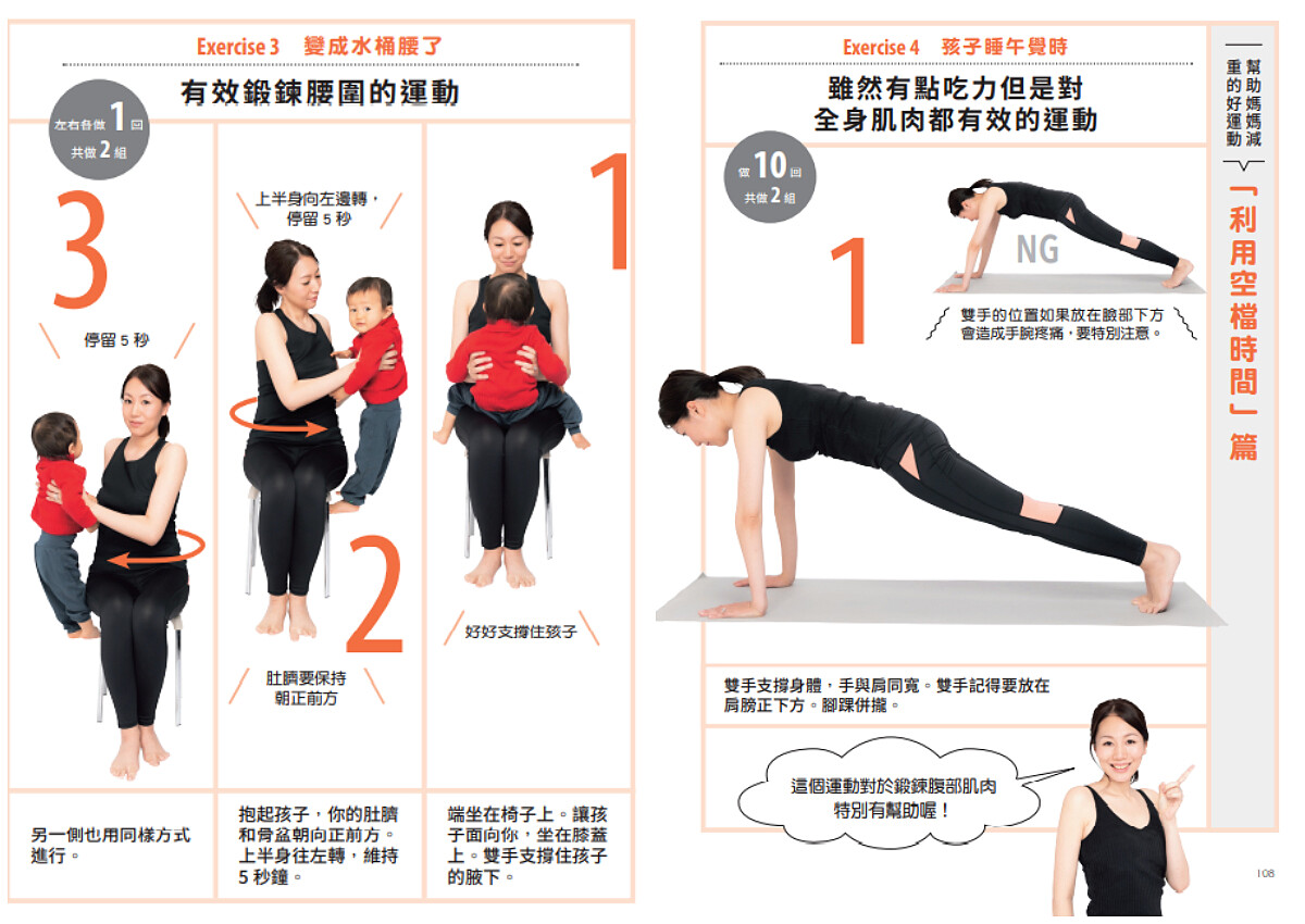 最重要的是,平常就要多使用腹部肌肉。媽媽在育兒過程中,身體常常需要前傾,因此很容易養成這種習慣。平常坐著習慣使用靠枕的人,等於是浪費了使用腹肌的機會!EICO教練說,當你坐在椅子上時,記得不要坐得太深,只要坐椅面的一半左右就好。這樣就可以一邊坐著,一邊鍛鍊腹肌喔!