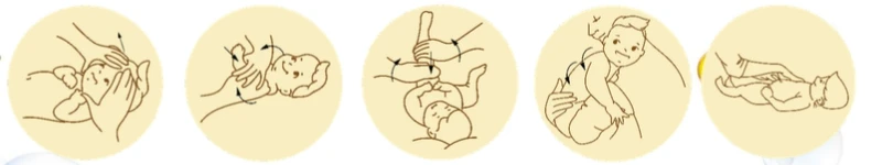 - 04. 右手放在寶寶腹部以肚臍為中心,慢慢的瞬時鐘方向畫半圓,左手以同樣方式畫出全圓、雙手輪流交替。