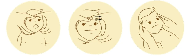 - 01. 按摩首先從臉開始,畫過額頭、眉毛、太陽穴,輕輕搓柔寶貝的耳朵,接續著人中、小下巴。