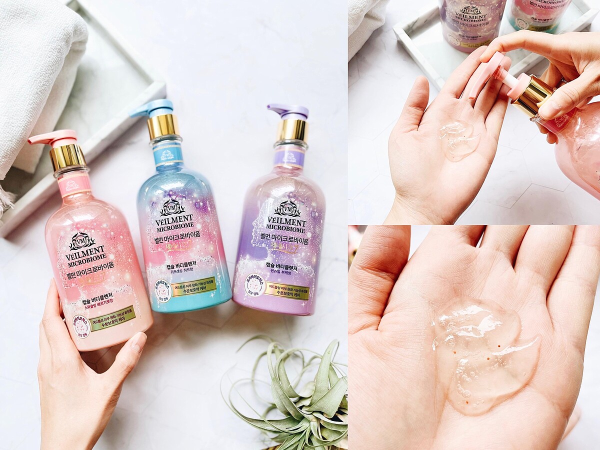 除了水楊酸和專櫃級護膚成分,仔細看看「VEILMENT蓓蔓 淨透美肌沐浴露」的質地,透明水感凝膠洗起來就像是SPA保養一樣很潤澤外,裡面還可看到一顆顆紅色的養肌晶球!這個養肌晶球是LG生活健康研究所特別鑽研Microbiome,分析肌膚的微生態後研發出的養肌晶球配方,植物性的晶球在沐浴時自然溶解,釋出含有酵母發酵溶解物等7種調理成分呵護肌膚,讓肌膚隨時維持在最佳的健康狀態!而「VEILMENT蓓蔓 淨透美肌沐浴露」的香氣也跟成分一樣來頭不小!與法國專業調香師合作,調出既持久又充滿層次的奢華香水香氛,有「馥郁花舞」、「絢采果韻」、「紓活草本」,花香、果香、草本香通通有,前中後調也讓氣味聞起來超高級!沐浴時伴隨著療癒香氣,根本就是SPA等級的享受呀!
