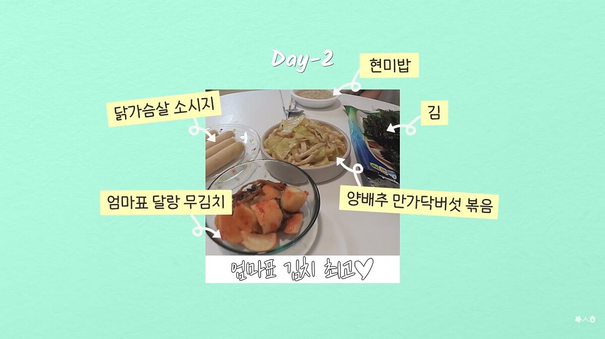 Day 2:糙米飯+蘿蔔泡菜+捲心菜炒磨菇+雞胸肉腸+紫菜
