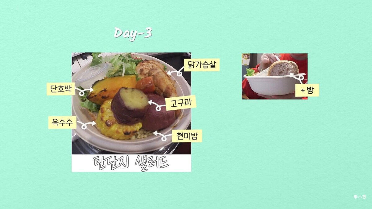 沒辦法在家自行料理時,外食就會選擇吃這種碳水、蛋白質、脂肪都很平均的沙拉。裡面包含少量糙米飯、地瓜、玉米、南瓜、小塊五穀麵包,以及雞胸肉和生菜沙拉。