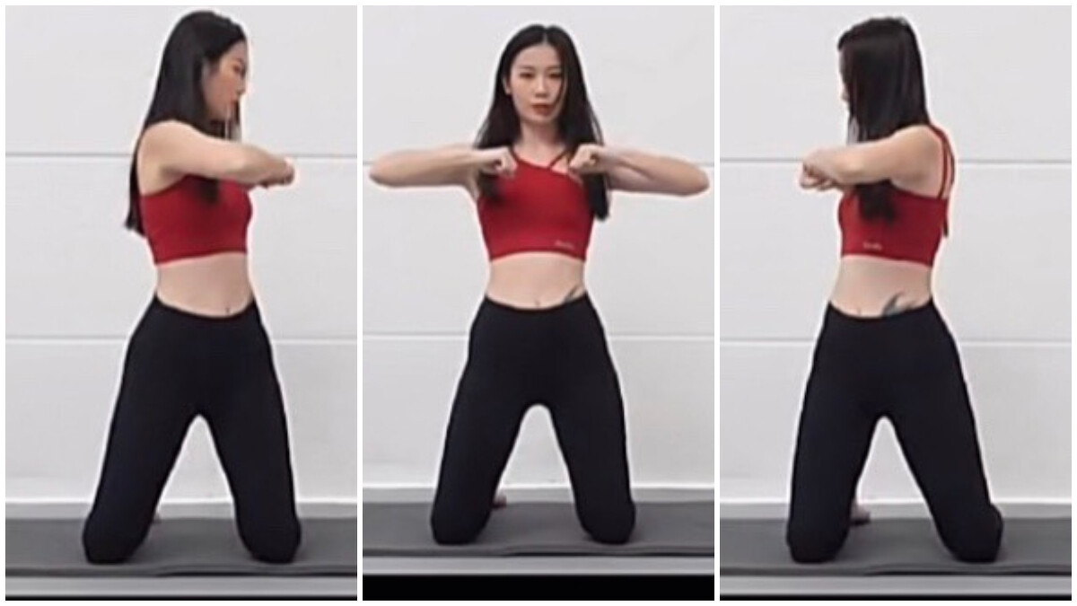 跪姿,手部抬起,手肘與地面平行,雙手握拳,往左側彎、回到中間、再往右側彎,回到中間,感受腰腹扭動,此動作重複練習60秒。
