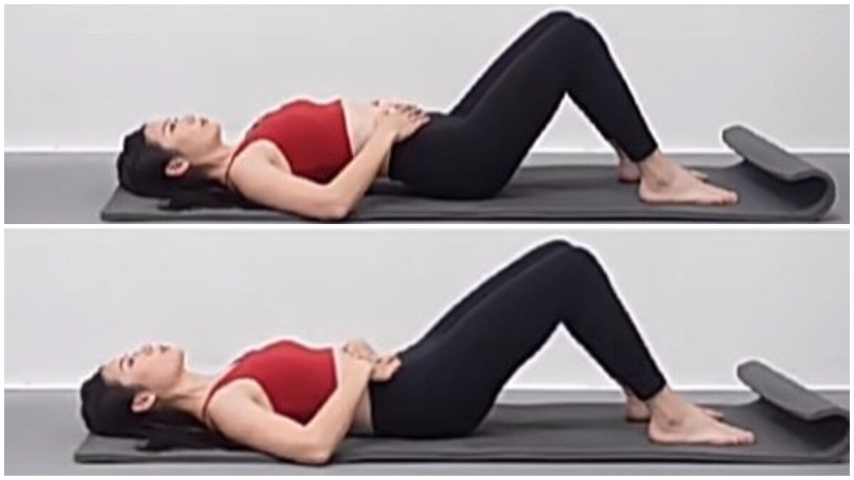 仰躺於瑜珈墊上,雙腿曲膝,雙手放置在肚臍處,感受呼吸起伏,順著呼吸,延長或收縮脊椎,要深長緩慢的呼吸,此動作維持60秒。