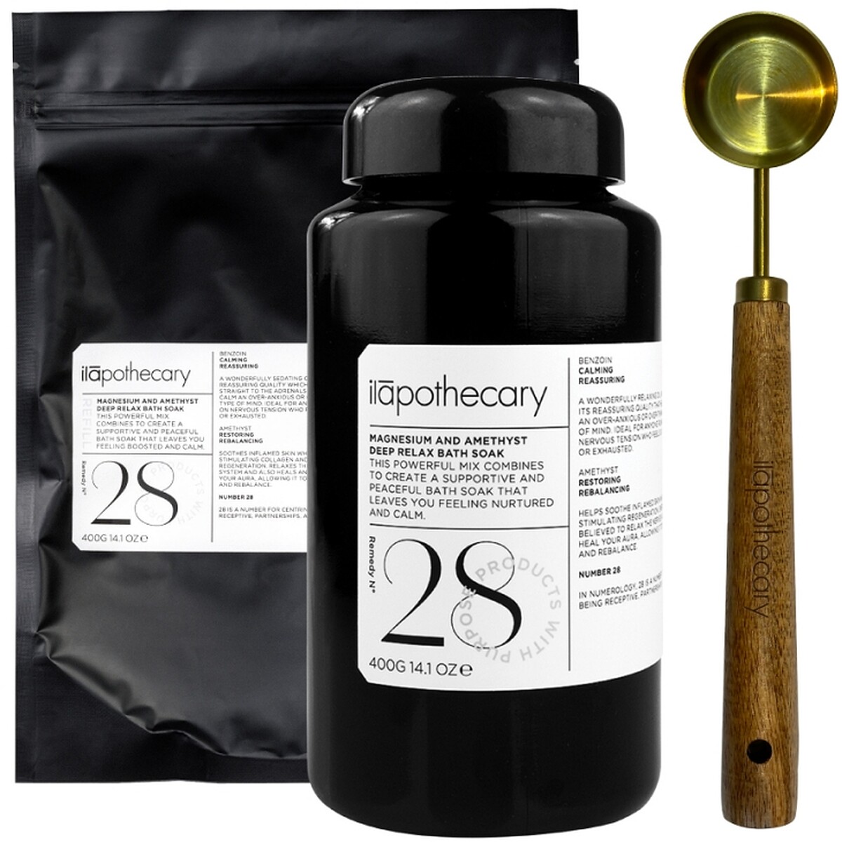 內容:No.28紫晶鎂夢好眠浴鹽400g、No.28紫晶鎂夢好眠浴鹽400g補充包、木柄不銹鋼鍍鈦挖勺。
