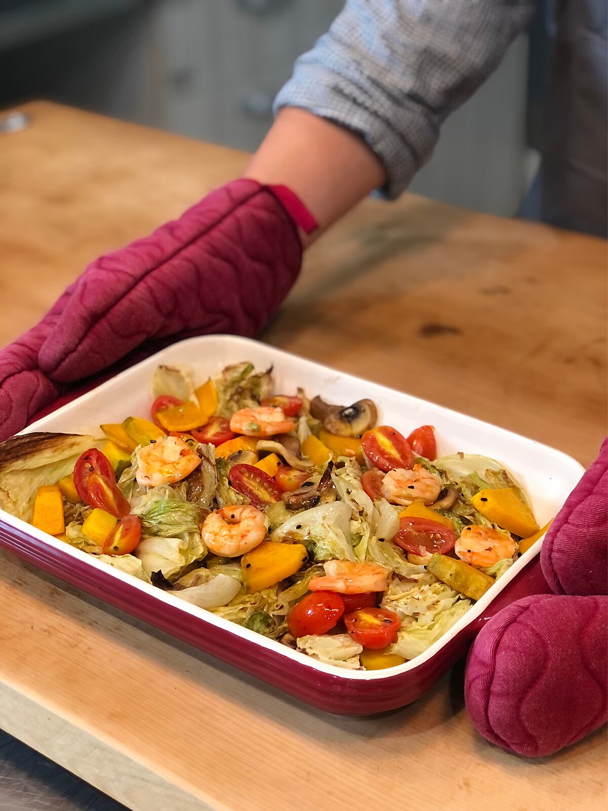 【食材清單】蝦子、南瓜、萵苣、小番茄、菌菇、巴薩米克醋、特級冷壓初榨橄欖油、黑胡椒