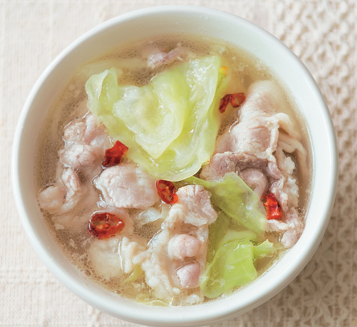 讓這道湯品更美味的祕訣就是大量使用高麗菜。高麗菜只要稍微煮一下,體積就會瞬間減少,還會大量吸收豬肉的鮮美精華,讓人吃個不停,想要更清爽的湯頭,可以加入檸檬片。檸檬釋放清爽的香味,一吃就上癮。