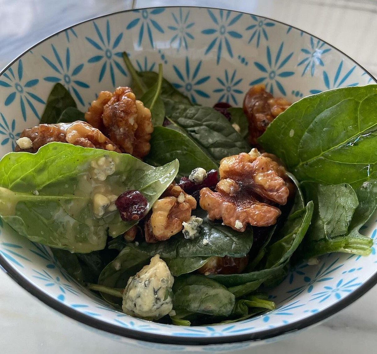 這是黎姿的低卡午餐~核桃沙拉,大部分堅果屬於低GI食物,含豐富植物性蛋白質和礦物質,吃適量對身體有益。她分享自己習慣每天吃8-10粒核桃,不只補充腦力,還能促進骨胳和心臟健康。