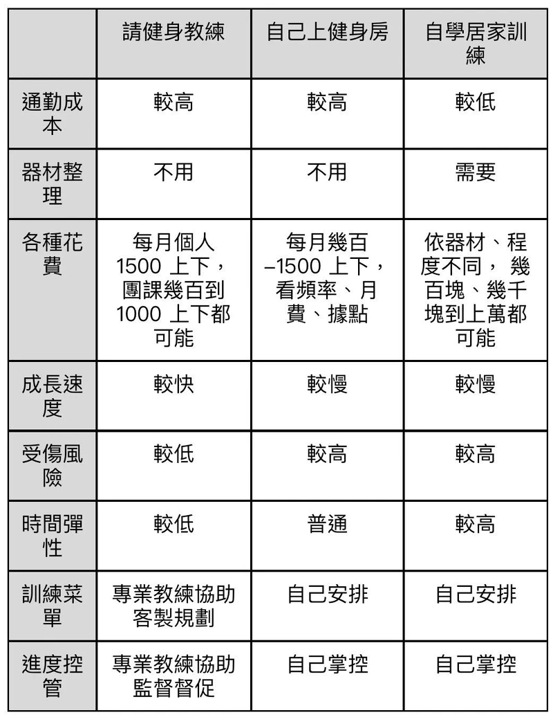 了解了這三種常見的健身管道後,這邊也整理比較三者各自的優、缺點: