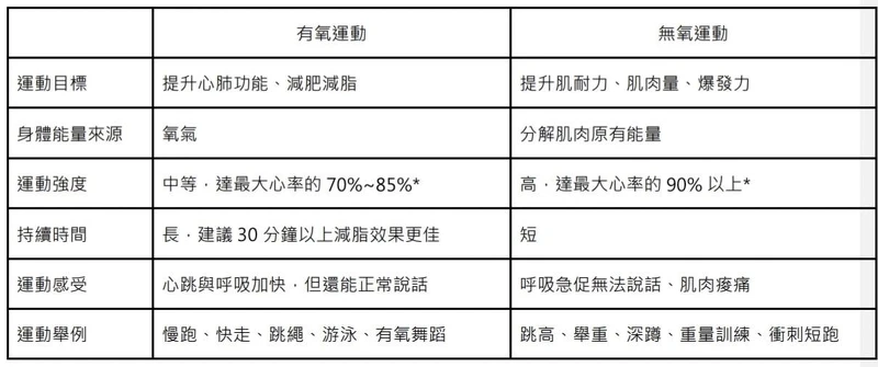 人體在運動時需要有足夠的能量,而這股能量可以從「有氧代謝」或「無氧代謝」合成,也就形成「有氧運動」和「無氧運動」的差異。這兩種運動除了能量來源不一樣之外,運動強度與目標也有所不同,在開始運動之前,先來看看「有氧運動」和「無氧運動」各自的特色: