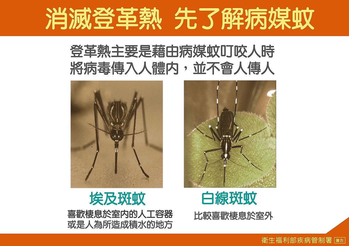 台灣傳播登革熱的病媒蚊為斑蚊屬,主要是埃及斑蚊與白線斑蚊,特徵是身體黑色,腳上有白斑,主要在白天活動及吸血,但分布、習性、活動時間及叮咬方式皆不同: