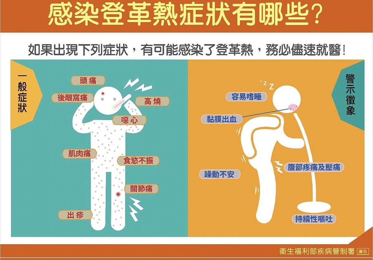 陳錦生說明,登革熱潛伏期通常為4~7天,典型登革熱的症狀為突發性38℃以上的高燒、頭痛、後眼窩痛、肌肉痛、關節痛及出疹等,因此又稱為「斷骨熱」。感染登革熱時,每個人的體質不一樣,可以從輕微或不明顯的症狀,到嚴重的登革出血熱;一旦出現呼吸困難、持續腹痛、持續嘔吐、四肢冰冷、肝臟腫大、出血(如流鼻血、解黑便、吐血、咳血、月經血過多等),以及嗜睡或躁動不安等警示徵象,必須馬上就醫。
