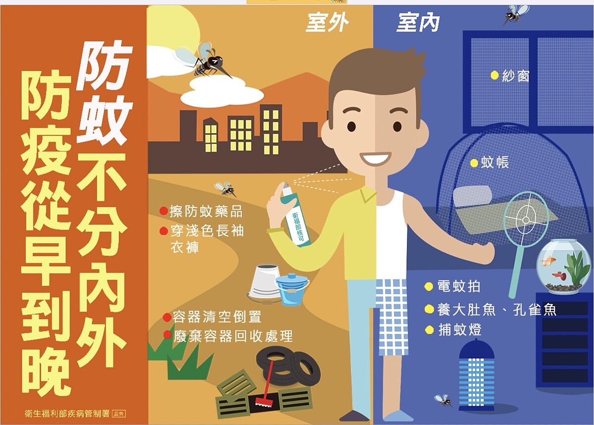 戶外活動時,穿著淺色長袖衣褲,避免在戶外樹陰逗留;家中裝設紗窗、紗門,並減少開關門的次數,平時使用蚊香驅蚊及噴灑殺蟲劑;睡覺時可掛蚊帳或使用電蚊拍、補蚊燈。另外,養殖水生植物的容器內,可飼養大肚魚、孔雀魚、台灣鬥魚等食蚊魚,可以降低病媒蚊叮咬的機會。