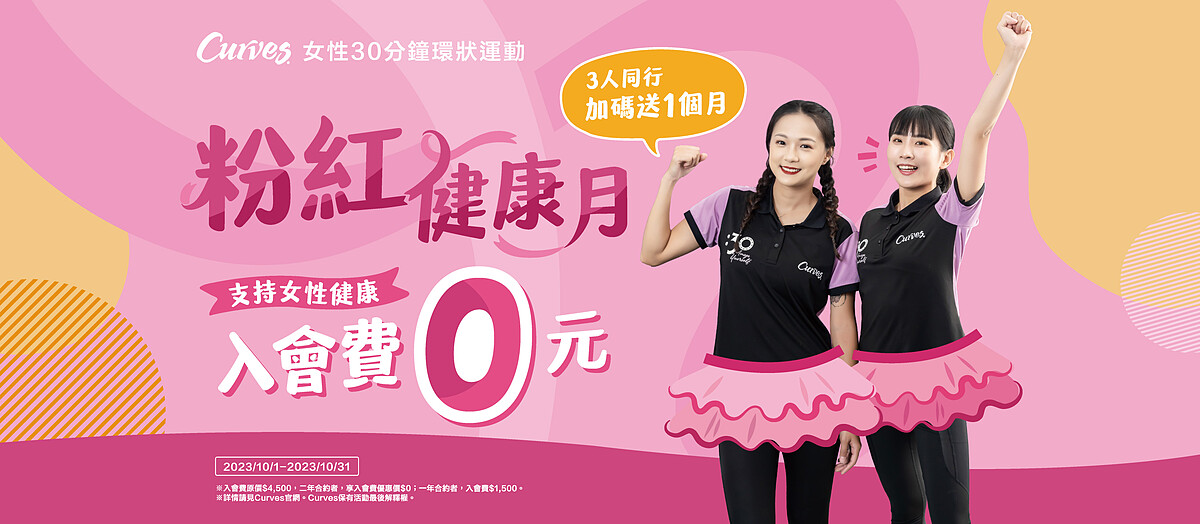 為支持女性的好朋友,Curves特別在10月與美麗佳人攜手,合作2023裙襬澎澎RUN路跑,並於當月推出【粉紅健康月】限時優惠,2023年10月1日起至10月31日止,將原價4,500元的入會費減免為0元,期望女性們與Curves一起挑戰自己,展開健康新生活!
