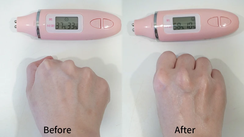 看看M編敏感又乾燥的肌膚,擦了「凡士林專業修護潤膚露」後,柔滑度與光澤感都上升,用保濕器測試水分從37%上升到58%,但質地優秀黏膩感降到18%,用起來超舒服,這就是專業修護力發揮效果的證明 。