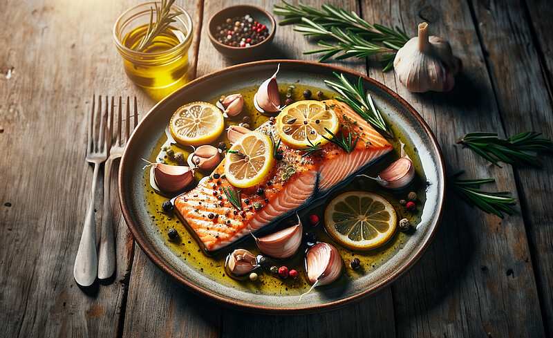 鮭魚菲力 4 塊、高品質橄欖油 4 湯匙、新鮮檸檬 1 個、大蒜 2 瓣切片、海鹽和黑胡椒適量、新鮮香草(如迷迭香、百里香)適量,青花椰苗 25g 以飲用水微洗瀝乾備用。