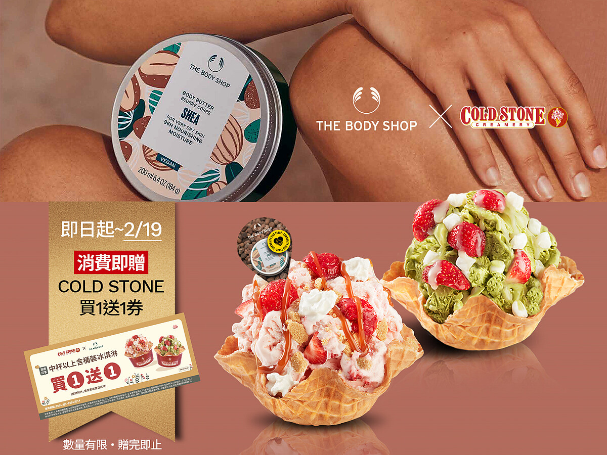 THE BODY SHOP帶大家龍年買買買,還有準備許多驚喜滿額禮大方送,滿NT$1,200起就得限定好禮外,即日起~2/19期間於門市不限金額消費,即能獲贈COLD STONE買一送一券乙張,可到酷聖石直營門市享中杯以上冰淇淋買一送一優惠(脆餅/桶裝除外;價低者為贈送品項),要讓大家甜甜過新年,數量有限大家動作一定要快!M編也整理好活動期間滿額贈商品,不但有人氣保養品,還有獨家設計商品等你全都搜刮回家!