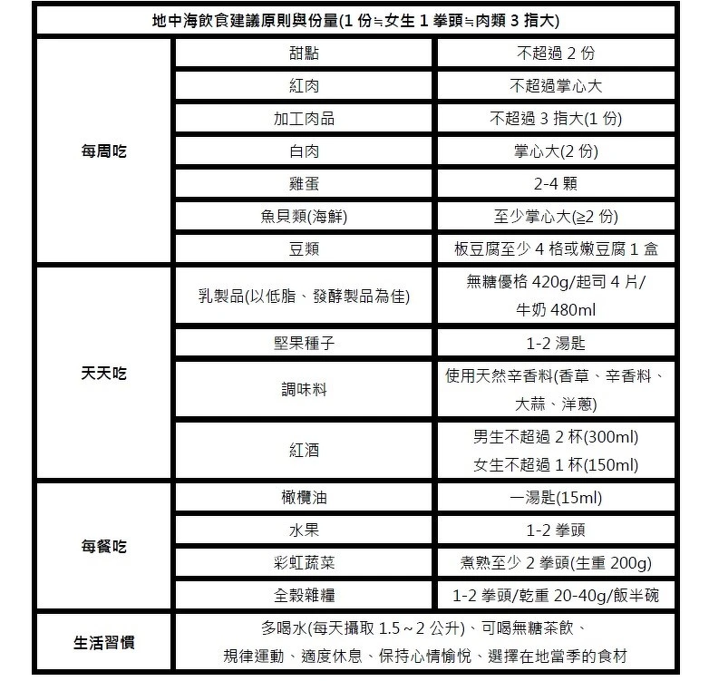 - 02. 蔬果:地中海飲食普遍適合大眾,但因攝取的水果與全榖雜糧類較多,若有特殊疾病如:糖尿病、腎臟病等,則須配合醫師、營養師或其他醫事人員控制飲食份量。