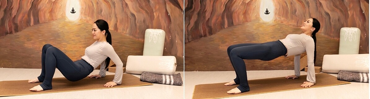 吸氣,用手臂力量抬高臀部,使身體形成一條直線,同時收縮臀部和手臂肌肉。