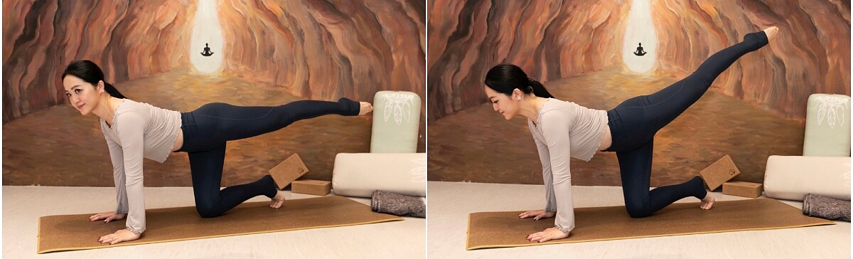吸氣,用右腿力量向後伸展,使右腿與身體呈直線,同時保持身體平衡。