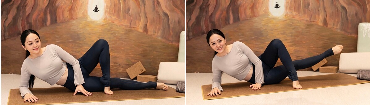 側躺姿,一腳伸直,一腳踩在另一腿前方大腿內側彎曲膝蓋踩地做支撐,伸展腳透過腹部核心運用及大腿內側肌力往上抬腿鍛煉。
