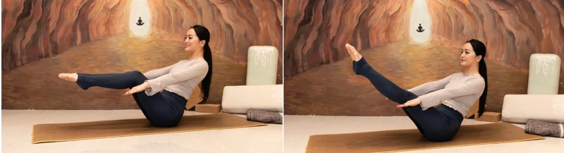 雙腳屈膝坐在瑜珈墊上,吸氣後上身向後傾,雙腳離地往上抬,直到小腿與地面平行。
