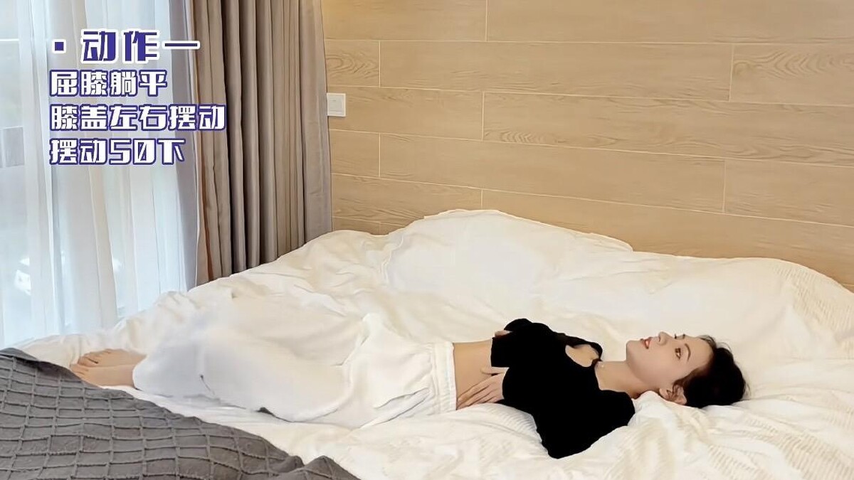 屈膝躺平,上半身不動,膝蓋左右擺動,此動作可以鍛鍊側腰肌肉,練出小蠻腰,每次50下。