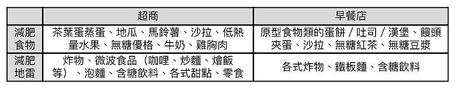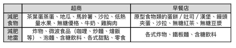 如果不曉得該如何在早餐店跟超商搭配出減肥早餐,可以參考以下範例。另外,在超商挑選商品可以查看營養成分標示,藉此精準算出攝取的熱量。
