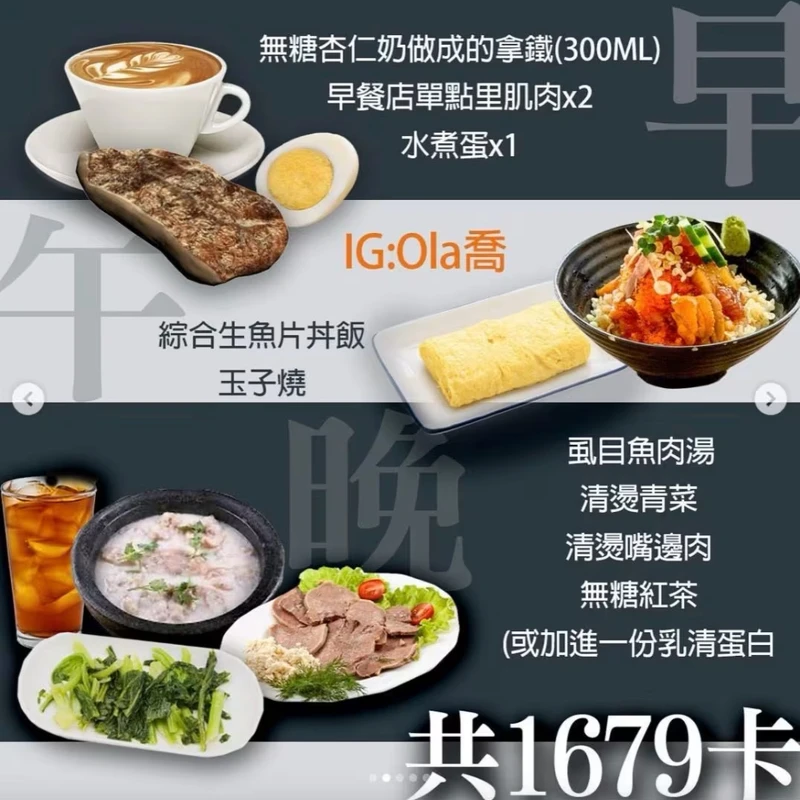 這樣的內容大約包含:蛋白質: 94克、碳水: 234克、脂肪: 29克,在減脂的女孩們,請更重視攝取足量的蛋白質。小小提醒愛美的女性們:減脂期間飲食搭配重訓,把肌肉量提升,才能提高代謝且降低復胖機率。