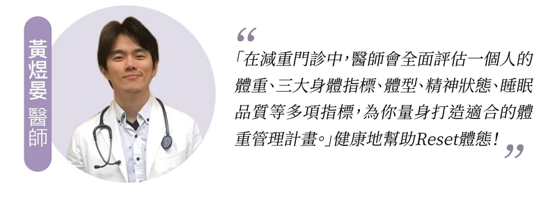 黃煜晏醫師強調,「在減重門診中,醫師會全面評估一個人的體重、三大身體指標(BMI、腰圍、體脂)、體型、精神狀態、睡眠品質等多項指標,才能為你量身打造適合的體重管理計畫。」真正有效又健康地幫助Reset體態。