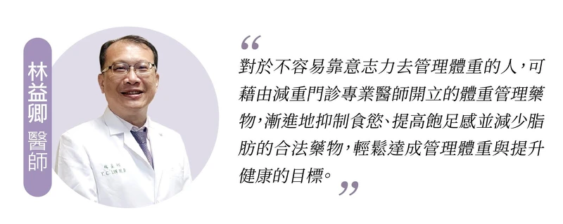林益卿醫師指出,對於不容易靠意志力去管理體重的人(難以控制食慾、太忙、不知如何做起、急著想改善體態…),減重門診中由專業醫師開立的體重管理藥物,是有效的輔助減重選擇!透過合法的減重藥物藉以抑制食慾、提高飽足感並減少脂肪,幫助你在不挨餓的情況下,輕鬆達成管理體重與提升健康的目標。