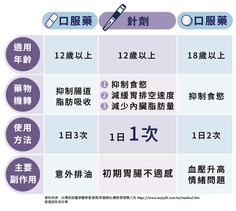 林益卿醫師表示,目前衛福部核准上市的有三款體重管理輔助藥物,包含可抑制人體食慾中樞及增加飽足感的腸泌素針劑、阻斷腸胃道脂肪吸收的口服藥及抑制食慾的口服藥,腸泌素針劑主要作用機轉是抑制食慾、延緩胃排空,還可達到減少內臟脂肪的目標。根據研究數據顯示,可幫助成人減重約5~10%。根據治療指引,在BMI>30或BMI介於27~30並伴隨一個以上肥胖共病症的病人,建議使用藥物治療;而BMI>40或BMI介於35~40且伴隨一個以上併發症的病人則需考慮採取手術治療,手術共病症包括:糖尿病、高血壓、睡眠呼吸中止症等。