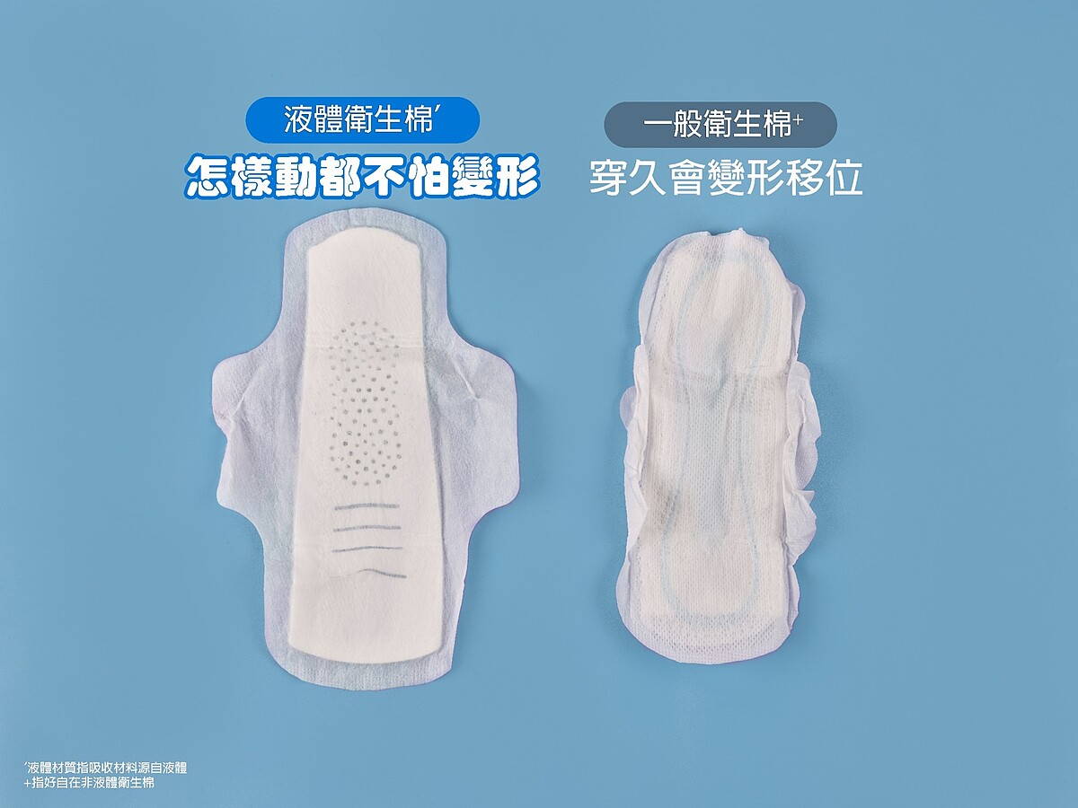 好自在液體衛生棉超貼合、不怕移位:新升級側邊翅膀貼合度提升20%,各種内褲都服貼 ; 連強調臀部的深蹲跟伸展的動作,都不怕衛生棉會變形,再也不擔心在外面跑跑跳跳會移位或側漏。