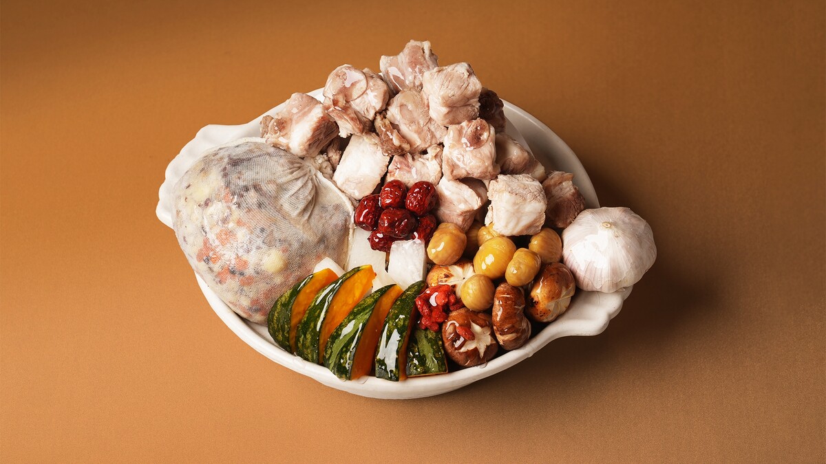 - 04. 最後將藥材料包﹑豬肋骨﹑白胡椒﹑蒜球放入鍋中大火煮滾後,轉小火煨煮 1 小時後調味即可。