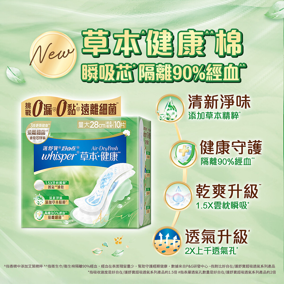 *隔離90%經血︰指衛生巾/衛生棉隔離90%經血,經血在表面殘留量少,幫助守護經期健康,數據來自P&G研發中心