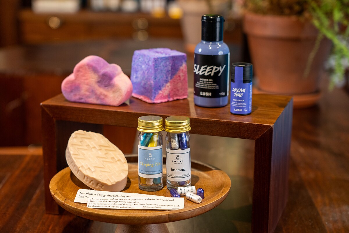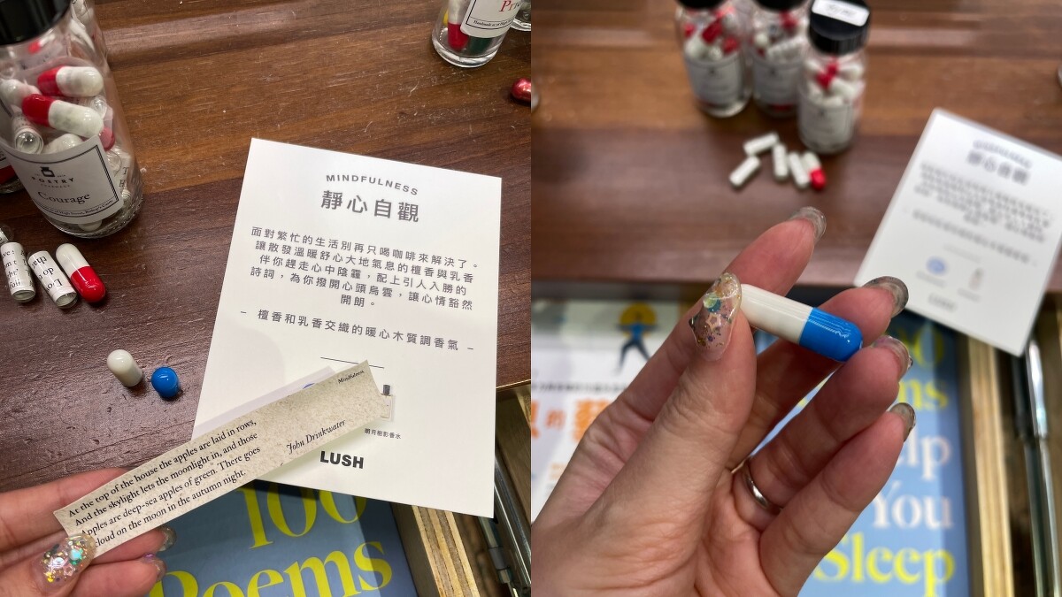 因此LUSH將遠在英國的詩籤藥局帶來台灣,以睡眠為題,挑選了 10 款相關的詩籤藥罐,包括一夜好眠、失眠之夜、社群排毒、靜心自觀、忠於自我等心情狀況,為大家開立詩詞處方籤,讓大家察覺自己的心情,並搭配相關香氣和適合放鬆產品,讓大家在睡前沉潛身心。