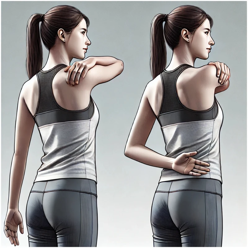 - 01. 站姿或坐姿,一隻手伸直,橫向跨過身體。