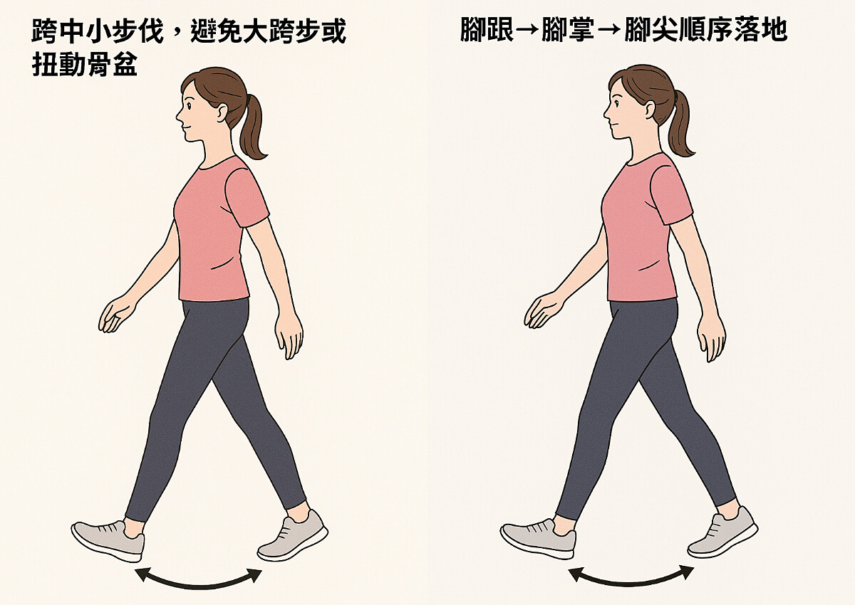 Step3:跨中小步伐,避免大跨步或扭動骨盆。