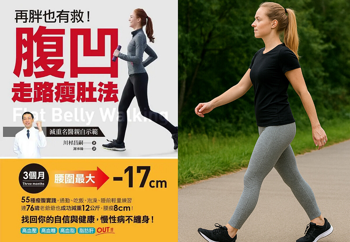 由日本減重名醫「川村昌嗣醫師」推出的「腹凹走路瘦肚法(お腹へこませウォーキング)」一書,內容教導的是一種透過凹腹+正確姿勢的走路法,只要在平常走路時養成一吸一吐收縮小腹,讓腹部內凹、外凸的習慣、並持之以恆,就能夠有效啟動深層肌肉(特別是腹橫肌),幫助瘦小腹、改善駝背、促進代謝,這是一個無須耗費時間與金錢,但卻極為有效地瘦小腹的方法。