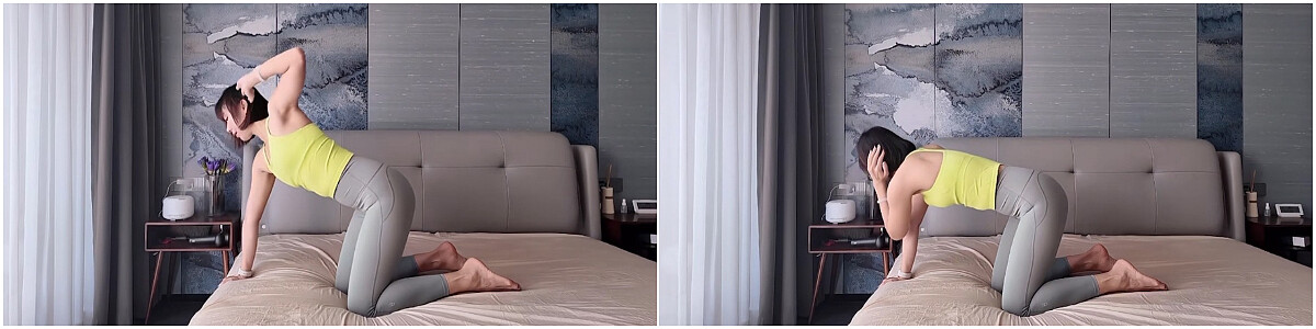 左手輕輕搭放在後腦勺,呼氣觸碰對側,吸氣外展打開,手肘盡量向外指向天花板,然後再呼氣內旋向對側,吸氣打開胸腔,感受前側胸廓的伸展、後側肩胛骨的擠壓,盡量保持骨盆在中間的位置,呼氣吸氣為一組,左右輪流各重複12次。