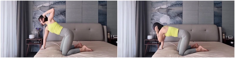 來到床邊俯身趴下,手臂向前平舉,呼氣的時候用力讓手肘向後向下夾緊背部,吸氣時手臂向前伸展,這個動作可以緊實背部、減少背部贅肉,還能消除腋下副乳,動作重複12次。最後一次動作時可以試著讓手肘關節更往下沉,把肩膀拉下來,脖子伸直,然後停在這裡保持動作別低頭,頭頂向前倒數3秒後呼氣,再結束動作。