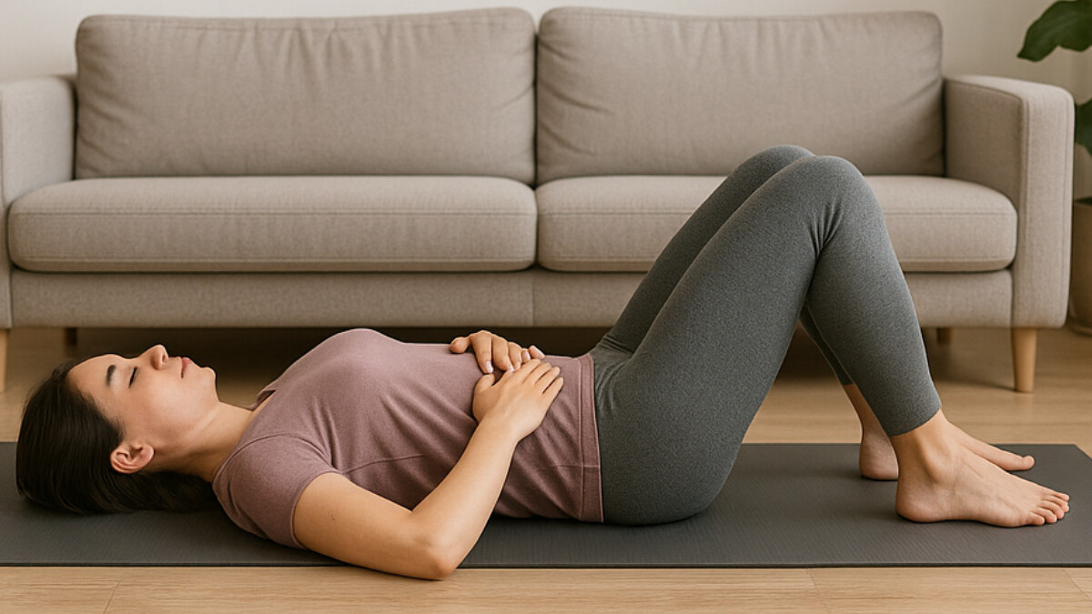 ●躺在瑜伽墊或床上,雙腿彎曲、腳掌平放,雙手放在腹部上。