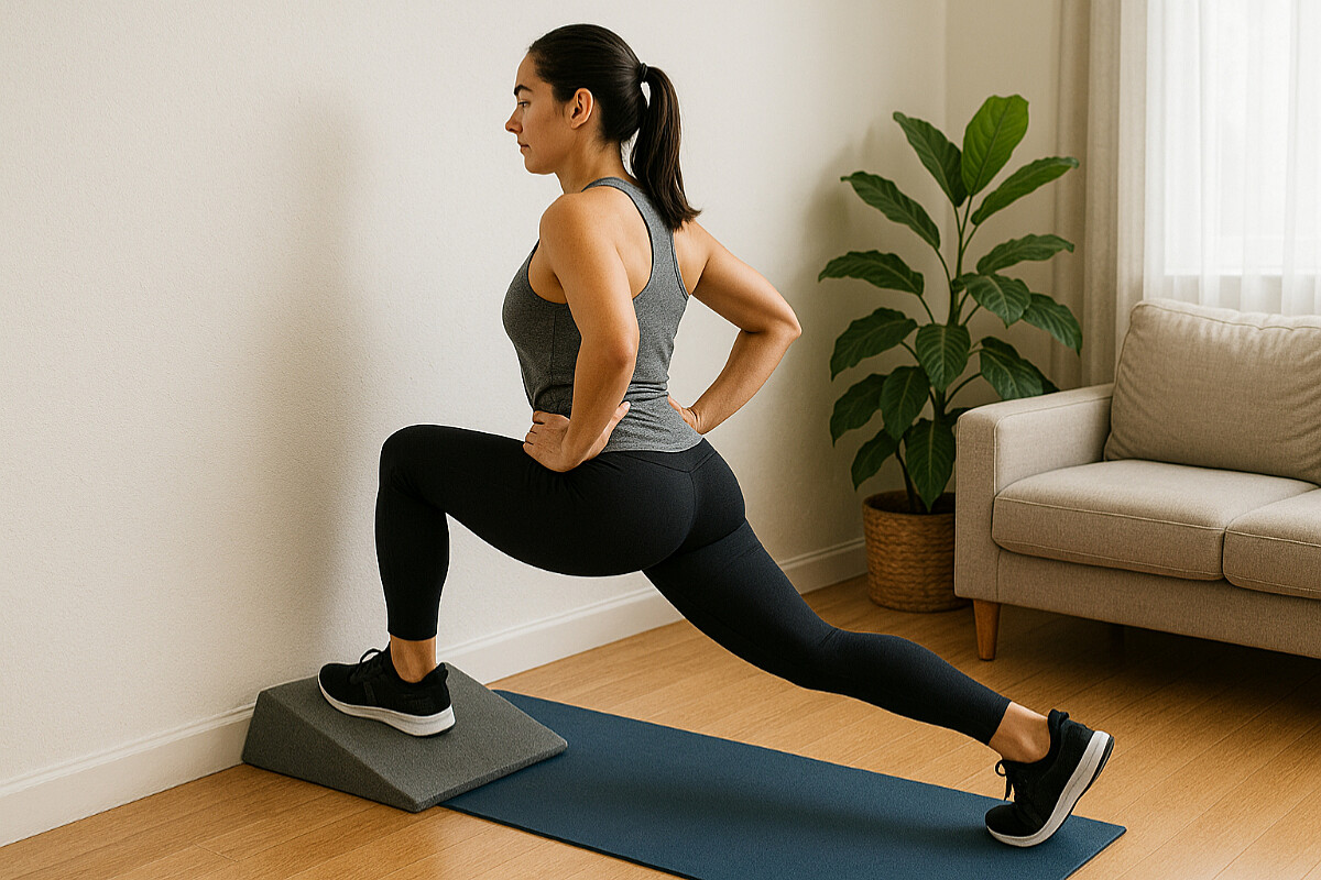 方法2、墊高版:準備瑜珈墊、健身踏板或堅固的書本堆,把前腳放在高處,後腳在低處,製造「坡度差」,模擬爬坡。