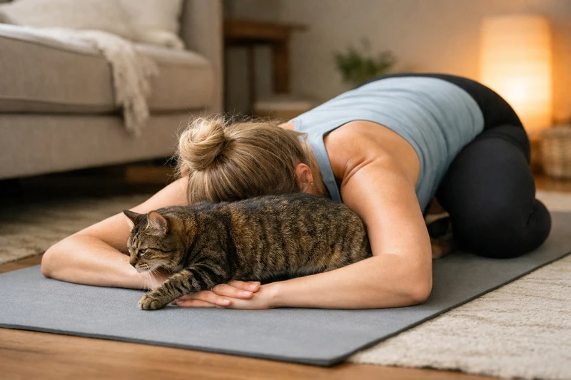 怎麼做:做嬰兒式時,手臂不要完全貼地封死前方,留一條空間讓貓能從妳手臂間穿過;妳每次吐氣就想像把背部變寬、變軟,停6–10個呼吸。